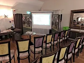 Then the fun starts with the showing of the race on our big screen.